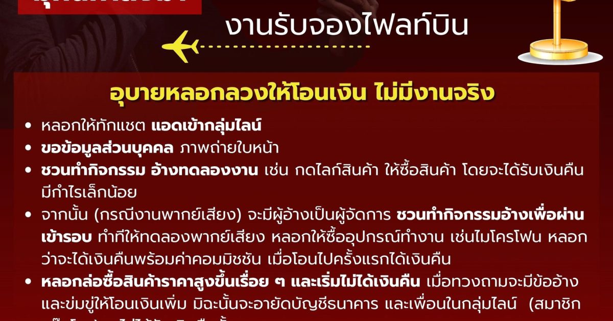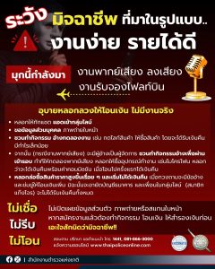 มุกนี้กำลังมา 3 กรกฎาคม 2565 โดย admin / ข่าวประชาสัมพันธ์,ข่าวฝากประชาสัมพันธ์ มุกนี้กำลังมามิจฉาชีพ ที่มาในรูปแบบ.. ( เสนอ ) งานง่าย รายได้ดีชวนทำงาน ที่แท้ลวงให้โอนเงิน.สำนักงานตำรวจแห่งชาติเตือนภัยออนไลน์ อุบายเดิม ๆ แต่มุกใหม่ ชวนทำงาน “พากย์เสียง ลงเสียง” “รับจองไฟลท์บิน” ล่อใจด้วยรายได้สูง.เมื่อเหยื่อสนใจทักแชต ก็จะเข้าทางคนร้ายชวนเข้ากลุ่มไลน์ทำกิจกรรม ให้โอนเงินลงทุนเล็ก ๆ น้อย ๆ หว่านล้อมล่อใจอ้างว่าทดลองงาน ทำกิจกรรมเพื่อเข้ารอบ ให้โอนเงินเพิ่มขึ้นเรื่อย ๆ ก่อนจะบ่ายเบี่ยงไม่โอนเงินให้ ซ้ำยังข่มขู่.ไม่เชื่อ ไม่รีบ ไม่โอน.ต้องรู้ไว้… .. หากสมัครงานแล้วต้องทำกิจกรรมโอนเงิน ซื้อสินค้า สำรองเงินก่อน ให้เอะใจว่าเป็นมิจฉาชีพ!!.. ไม่ส่งข้อมูลส่วนตัว ภาพถ่ายใบหน้า หรือสแกนใบหน้าให้บุคคลอื่น โดยเฉพาะผู้ที่มาชักชวนทำงาน ทำกิจกรรมทางออนไลน์.. หากไม่แน่ใจ สงสัย ให้โทรสอบถามตำรวจที่ โทรสายด่วนตำรวจไซเบอร์ โทร.1441ด้วยความปรารถนาดีจาก “สำนักงานตำรวจแห่งชาติ”#เตือนภัยออนไลน์#วัคซีนไซเบอร์ #ไม่เชื่อไม่รีบไม่โอน#สำนักงานตำรวจแห่งชาติ FacebookFacebookXXLINELine