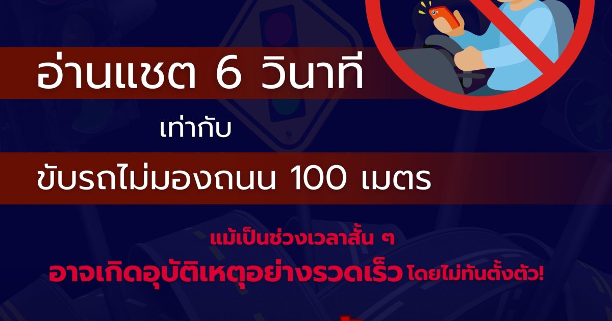 รู้หรือไม่ ทุกครั้งที่ท่านใช้โทรศัพท์มือถือระหว่างขับรถ มีความเสี่ยงเกิดอุบัติเหตุทุกครั้งที่อ่านแชตเพียง 6 วินาที เท่ากับ ขับรถโดยไม่มองถนน 100 เมตร