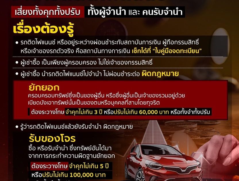 เมื่อวันที่ 1 กุมภาพันธ์ 2567 พล.ต.ต.ศิริวัฒน์ ดีพอ รองโฆษกสำนักงานตำรวจแห่งชาติ กล่าวว่า พล.ต.อ.ต่อศักดิ์ สุขวิมล ผบ.ตร. มีความห่วงใยพี่น้องประชาชนที่อาจได้รับความเสียหายจากอาชญากรรมรูปแบบต่าง ๆ โดยปัจจุบันได้มีพี่น้องประชาชนที่ประสบปัญหาภาระหนี้สิน เนื่องมีความจำเป็นต้องใช้เงิน หรือต้องรีบหาเงินมาชำระให้กับเจ้าหนี้ ได้นำรถยนต์ที่อยู่ระหว่างการผ่อนชำระกับสถาบันทางการเงิน หรือที่เรียกว่า “รถติดไฟแนนซ์” ไปจำนำไว้กับผู้ที่ประกาศรับจำนำรถ ทั้งที่ยังมีภาระหนี้สินกับไฟแนนซ์อยู่