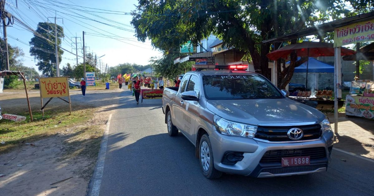 ร.ต.อ.พงษ์ศักดิ์ หมื่นพรม รอง สว.(จร).สภ.สิรินธร จร.60 พร้อมด้วย ร.ต.ท.บุญโสม แป้นเพชร, ร.ต.ต.ทศพร โพธิ์เงิน ปฏิบัติหน้าที่อำนวยความสะดวกการจราจรขบวนพาเหรดกีฬาสีโรงเรียนสิรินธรวิทยานุสรณ์ จากถนนเส้นในบ้านเรียงแถวใต้(หน้ากรีนรูฟ)-สนามฟุตบอลโรงเรียนสิรินธรวิทยานุสรณ์ ต.นิคมฯ อ.สิรินธร จว.อุบลราชธานี