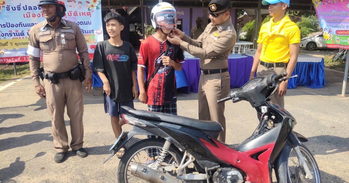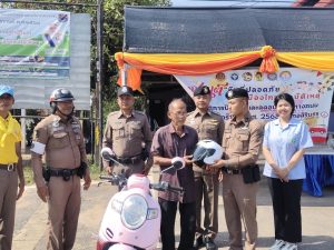 พ.ต.ท.สุรชัย พันโบ สวป.สภ.สิรินธร และชุดจิตอาสา สภ.สิรินธร มอบหมวกนิรภัย โครงการจิตอาสาจราจรณรงค์การขับขี่ปลอดภัยสวมหมวกนิรภัยเพื่อลดอุบัติเหตุจราจรทางบกในห้วงเทศกาลสงกรานต์