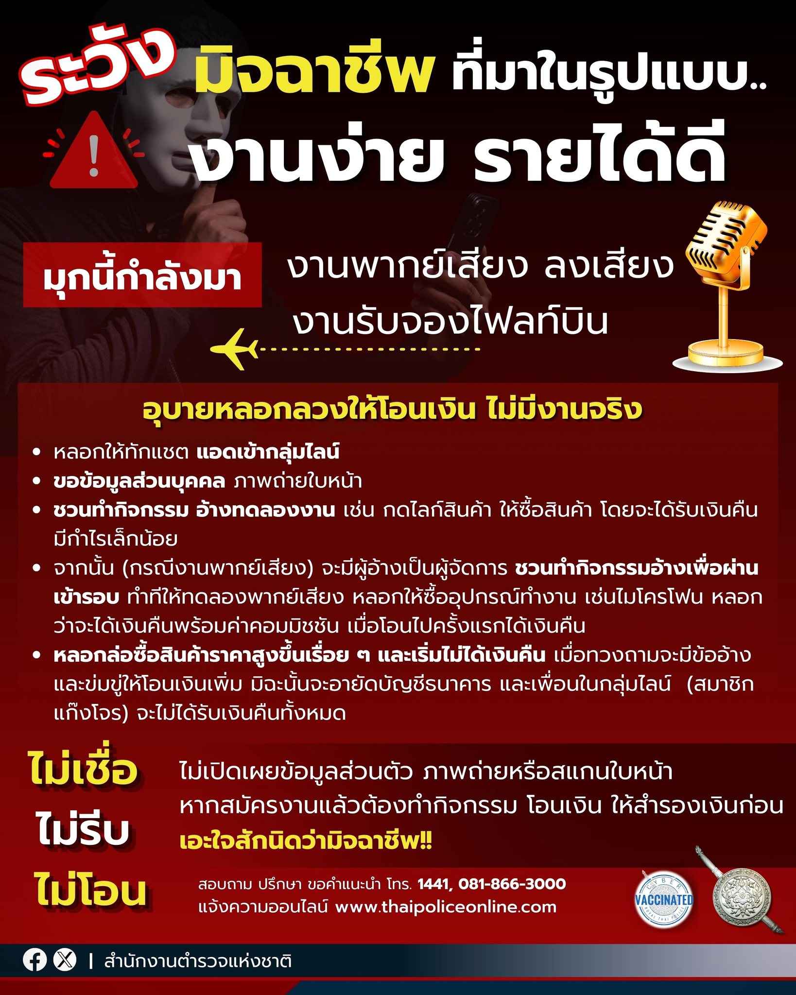 มุกนี้กำลังมามิจฉาชีพ ที่มาในรูปแบบ.. ( เสนอ ) งานง่าย รายได้ดีชวนทำงาน ที่แท้ลวงให้โอนเงิน.สำนักงาน