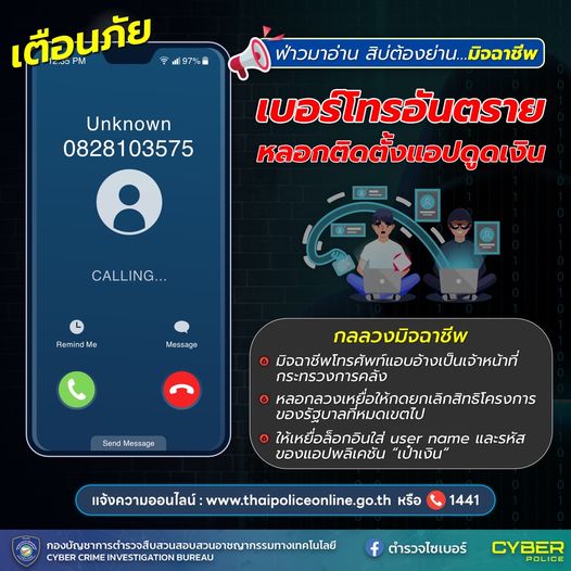 ตำรวจไซเบอร์เตือนภัยเบอร์แปลก หลอกติดตั้งแอปดูดเงิน . ช่วงนี้มีข่าวเบอร์โทรอันตราย 082-810-3575 อ้าง