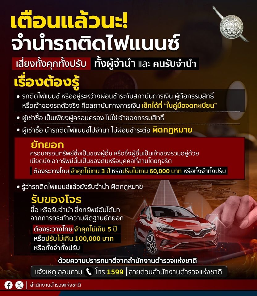 ตร. เตือน จำนำรถติดไฟแนนซ์ ผิดกฎหมาย! คนรับจำนำ หรือซื้อรถหลุดจำนำ เสี่ยงผิด “รับของโจร”