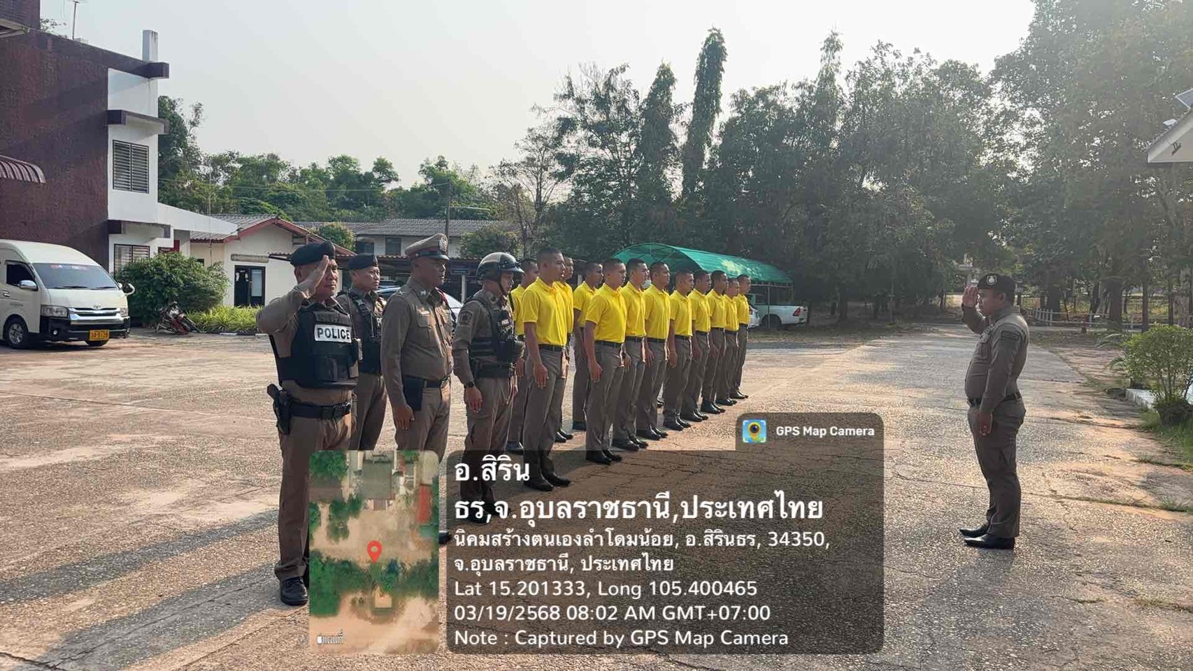 เวลา 08.00 น. พ.ต.ท.สุรชัย พันโบ สวป. สภ.สิรินธร พร้อม ร้อยเวร 20, ชุดสายตรวจ, นสต.ฝึกงาน เข้าแถวเคา